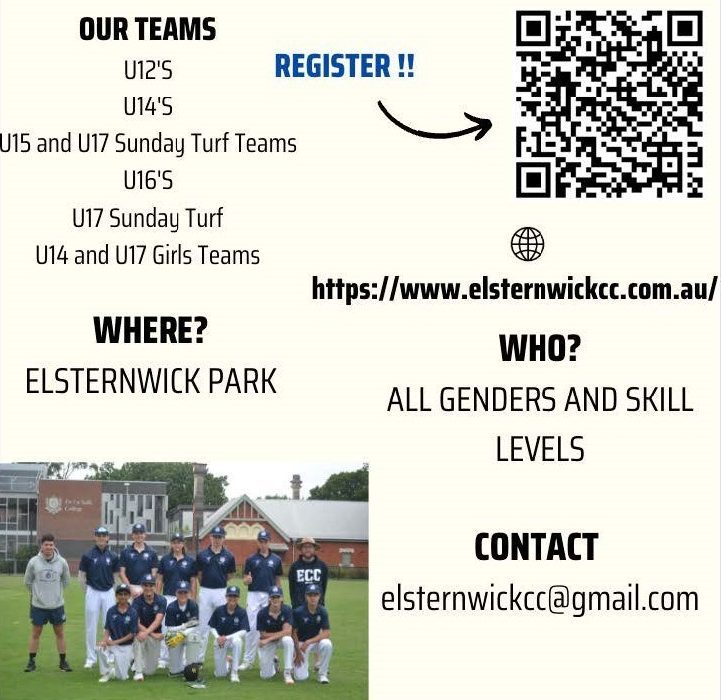 Elsternwick Cricket Club is now recruiting players for their junior competitions. If your child would like to be part of the team, simply scan the QR code, follow the link below or email the team directly.